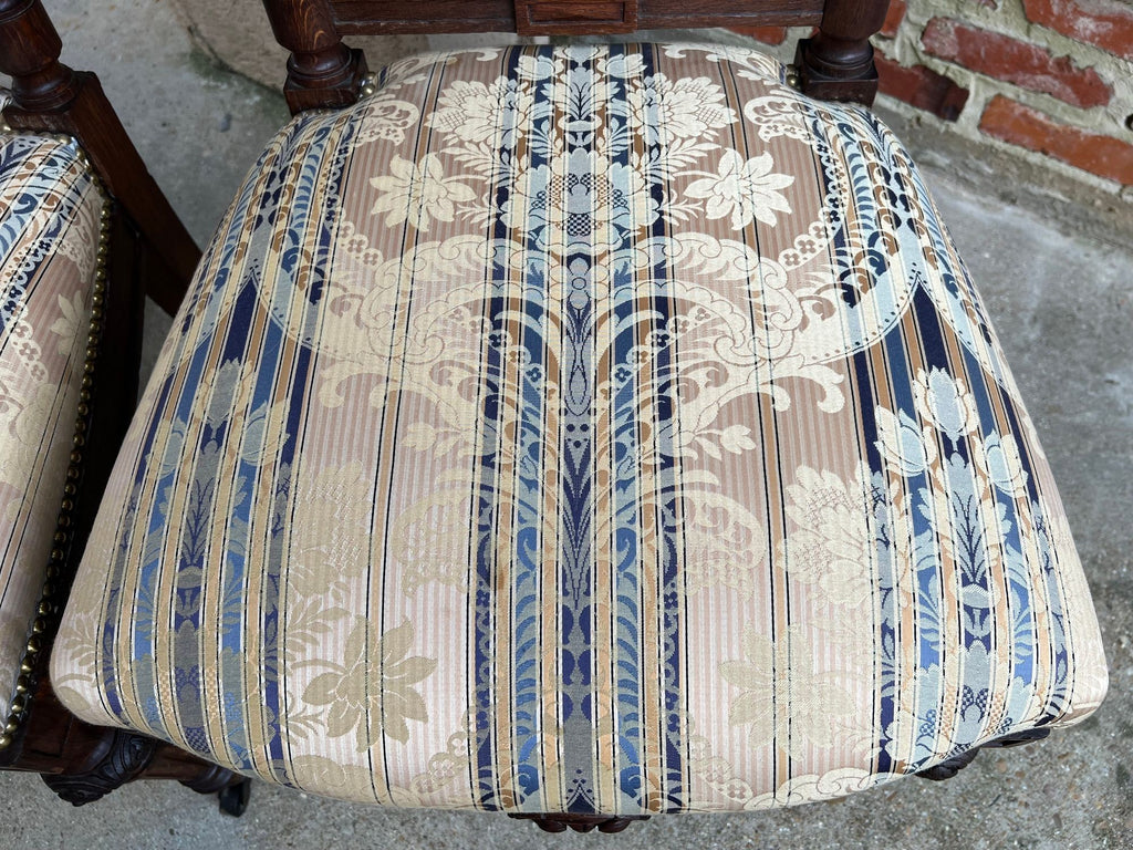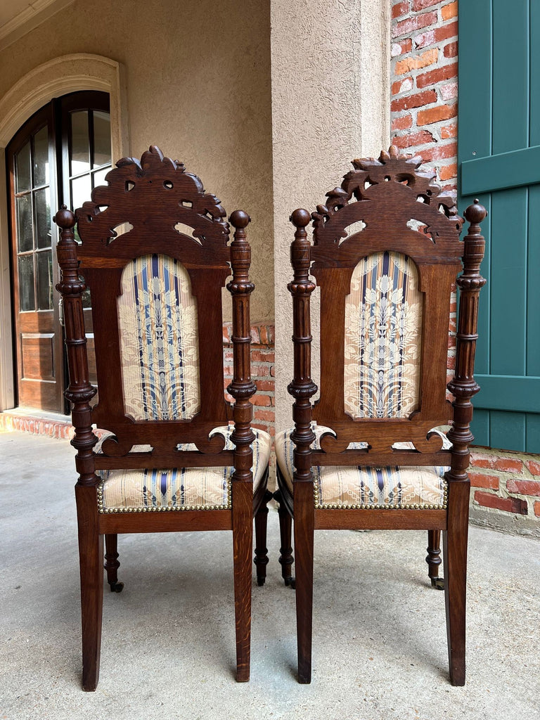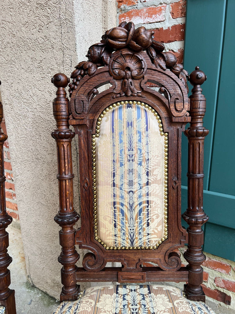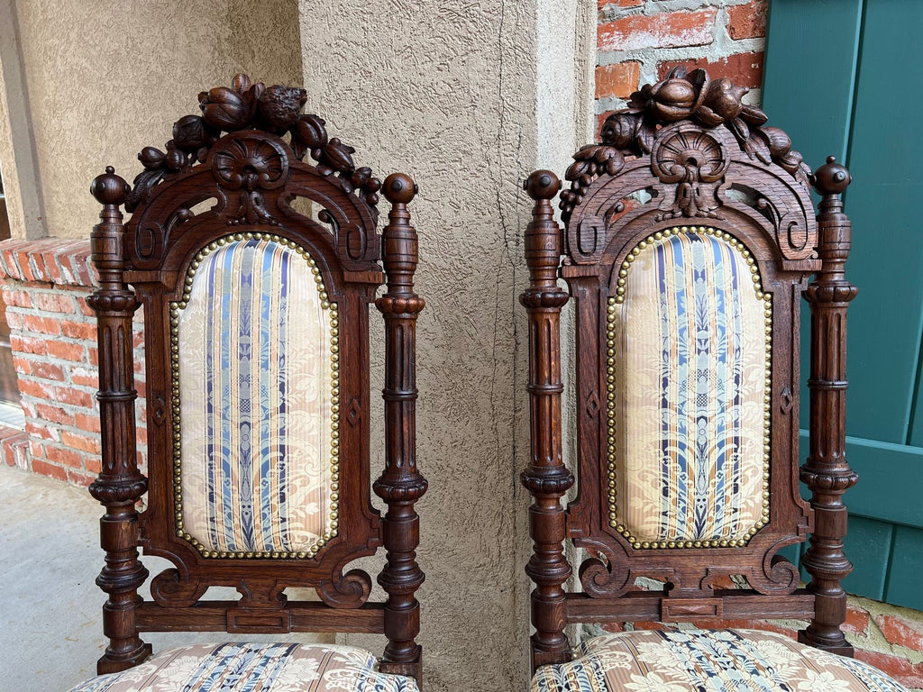 Pair Antique French Dining Chairs Renaissance Carved Oak Black Forest c1880