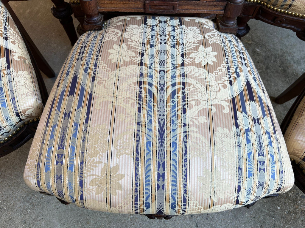 The luxurious high-quality damask-style textile in blues, beiges and ivory is fully outlined in brass nailhead trim and repeated on both the chair seats and chair backs.