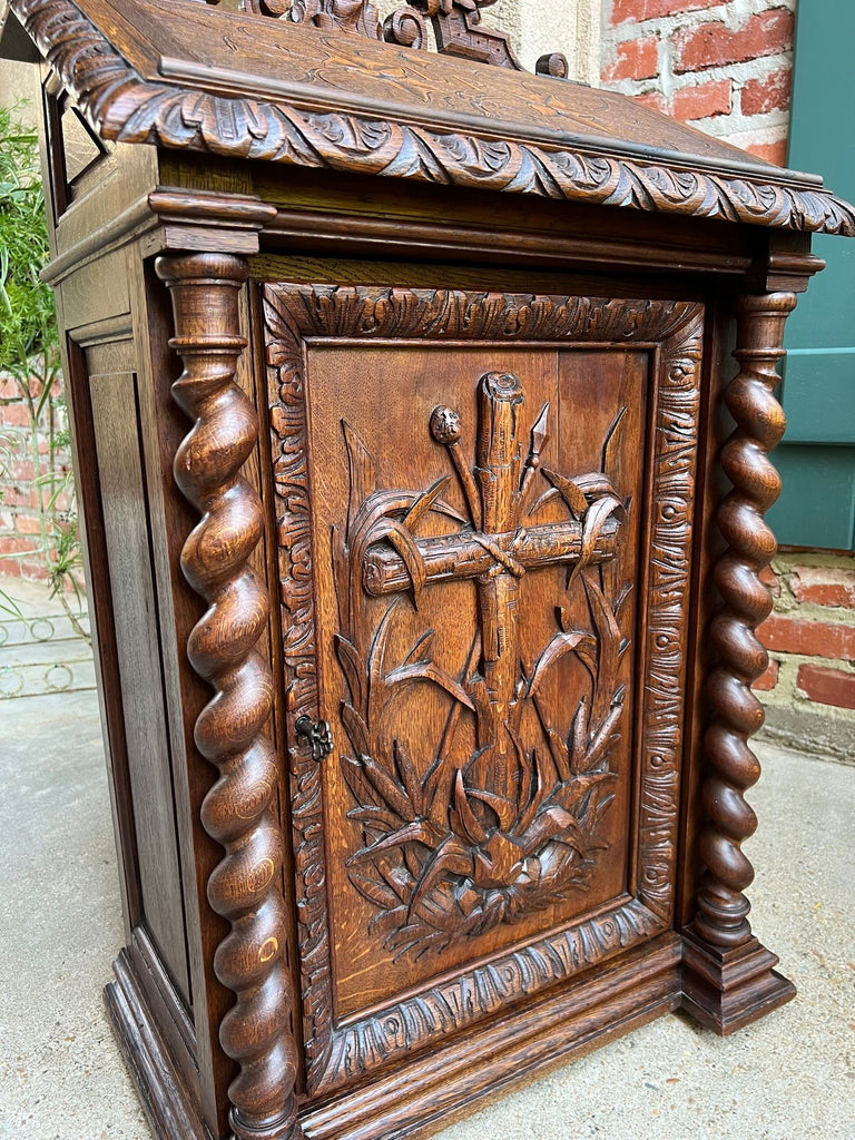 Direct from France, an exquisitely hand-carved 19th century French ecclesiastical cabinet that features deeply sculpted Gothic and Renaissance Revival details. The large front door panel is adorned with a hand carved cross, foliage and laurels--classic Christian symbols of faith and victory.